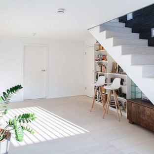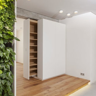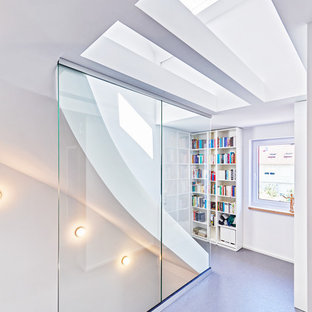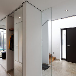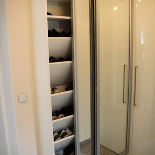 Im Treppenauge zwischen den Treppenläufen ist oft Platz um einen Windfang mit integrierter Möbelfunktion einzubauen. Zwei Türen verschließen die Treppenläufe und werden je nach Bedarf vor das Möbelstück geschoben. Das Möbelstück kann eine Garderobe oder ein Stauraumschrank sein, welcher dann optisch ideal auf die Gleittüren abgestimmt wird.
