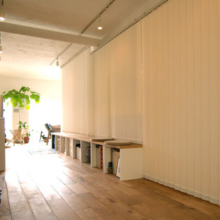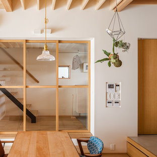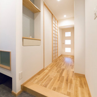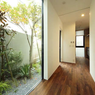 二世帯住宅の1階・ご両親の住まいの玄関には大きな開口を設け、外の植栽を楽しめる工夫をしました。落葉樹を植え、季節感を感じられる演出です。正面にあるサニタリールーム、その奥の寝室からも景色をのぞめるよう、開口の位置を計算してつくられています。