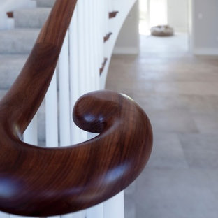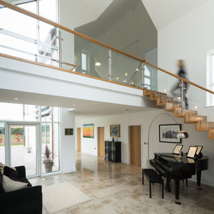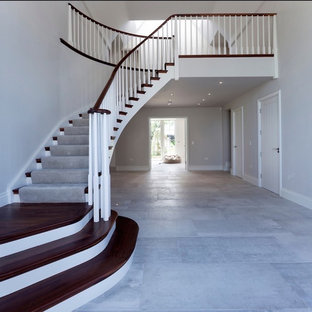 Working with & alongside the Award Winning Janey Butler Interiors, on this fabulous Country House Renovation. The 10,000 sq ft House, in a beautiful elevated position in glorious open countryside, was very dated, cold and drafty. A major Renovation programme was undertaken as well as achieving Planning Permission to extend the property, demolish and move the garage, create a new sweeping driveway and to create a stunning Skyframe Swimming Pool Extension on the garden side of the House. This first phase of this fabulous project was to fully renovate the existing property as well as the two large Extensions creating a new stunning Entrance Hall and back door entrance. The stunning Vaulted Entrance Hall area with arched Millenium Windows and Doors and an elegant Helical Staircase with solid Walnut Handrail and treads. Gorgeous large format Porcelain Tiles which followed through into the open plan look & feel of the new homes interior. John Cullen floor lighting and metal Lutron face plates and switches. Gorgeous Farrow and Ball colour scheme throughout the whole house. This beautiful elegant Entrance Hall is now ready for a stunning Lighting sculpture to take centre stage in the Entrance Hallway as well as elegant furniture. More progress images to come of this wonderful homes transformation coming soon. Images by Andy Marshall