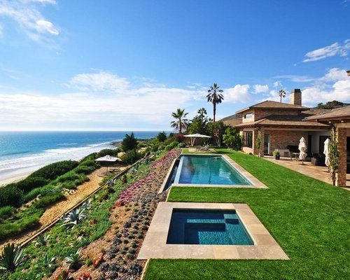 Pool with slope not retaining wall (don't want infinity pool as we will need to plant hedging around edge iof pool area to protect from winid - candslloyd