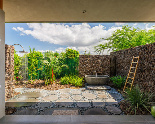Guest bathroom with walk-in shower and bathtub combination. Exterior opening has privacy glass allowing a view of the garden when desired. Hal Lum