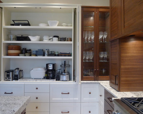This kitchen was totally transformed from the existing floor plan. I used a mix of horizontal walnut grain with painted cabinets. A huge amount of storage in all the drawers as well in the doors of the cooker hood and a little bread storage pull out that is usually wasted space. My signature corner drawers this time just having 2 drawers as i wanted a 2 drawer look all around t ...