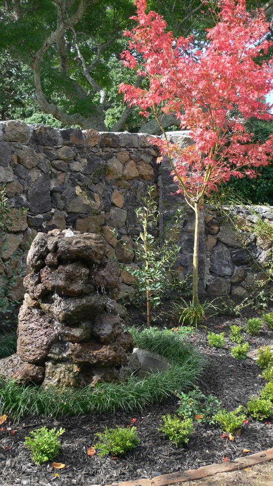 Water feature built out of the original chimney foundation stones. As the planting between it and the boundary wall fills out , it will stand out more.