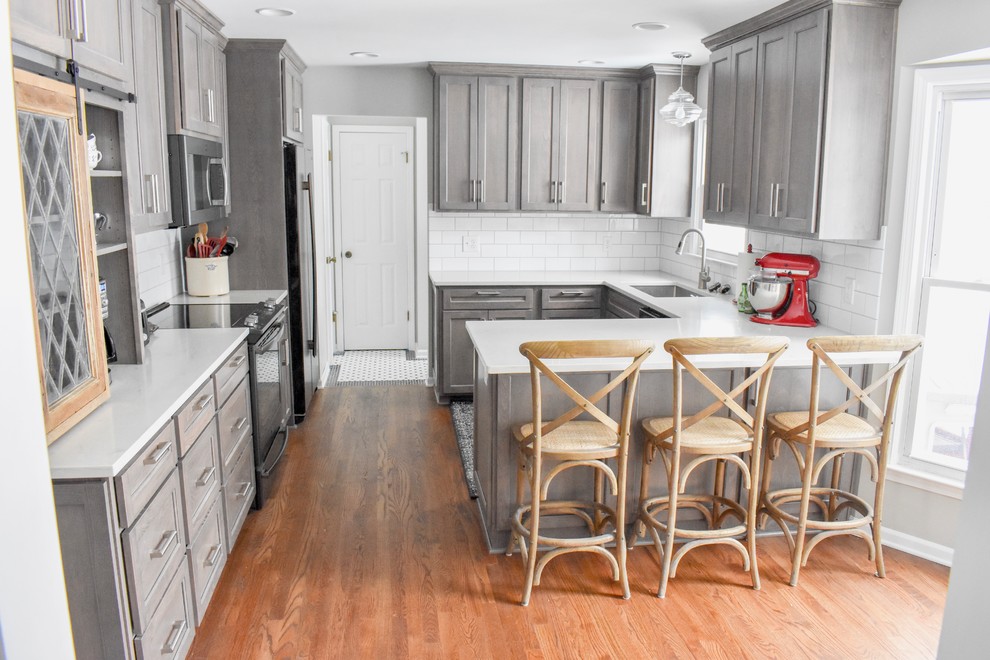This remodel used a similar footprint but gained some great new use of the space. An overhang to the peninsula for seating, more functional cabinetry with drawer banks and trash pullout, and a custom coffee bar with a vintage window were the big gains in this space. Hardwoods throughout the kitchen and living room meet black and white hex tile in the back hall and powder bath.