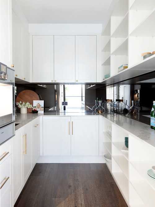 Photography: Shania Shegeden. Oozing luxury and glamour this kitchen is a modern take on the traditional Shaker style. Featuring stunning Gaggenau appliances throughout, Caesarstone Statuario Maximus benchtops and splashback and Shaker style cabinetry in matte white and black; this is a kitchen that demands attention.