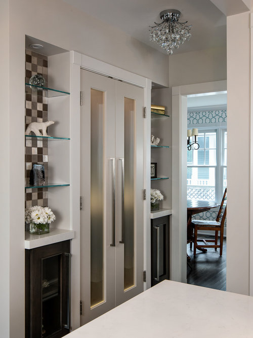 The homeowner's favorite part of this kitchen remodel was a gorgeous walk-in pantry, highlighted with opaque glass doors, a beverage center and quartz countertops.