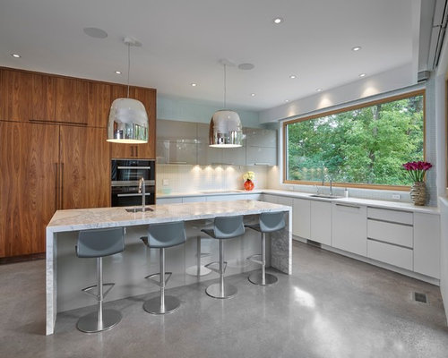This stunning contemporary kitchen features a three combination finish of matte white lacquer, grey high gloss and flat cut domestic walnut veneer.