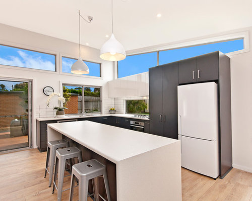 End-of-island display. The end drawers on this island have glass fronts and false backs so the homeowners can display cookbooks, colorful fruit, pasta, candy or whatever they please. Behind the false backs is regular storage. Cabinets by Medallion Cabinetry: Maple Islander with Coastal finish (base cabinets) and Maple Cottage in white finish (upper cabinets); island hardware: round glass cup pulls, Restoration Hardware; countertop: Cambria in Brittannica; pendants: Elementary Schoolhouse cord-hu - dcbautista