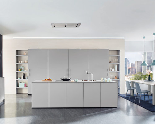 Die Decklüftung bietet eine Alternative zu den Kochfeldabzügen. Das Sideboard bietet zusätzlichen Stauraum und ist gut in die Küchenplanung integriert. Die Küchenmöbel kommen von Ballerina. Die Front heißt Ballerina XL 3389