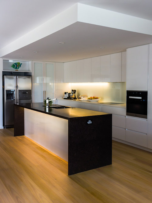 Modern contemporary style kitchen with a unique custom design specific to the clients requirements with finishes such as Frosty Carrina Caesarstone Benchtops, 2 Pac Satin Polyurethane flat panel doors, Laminex Designer Timber Veneer Alura Ash Fine Grain Feature doors, benchtops edges & open shelving, Brushed Stainless Laminate kickboards, Bar Handles, cool white LED down lights ...