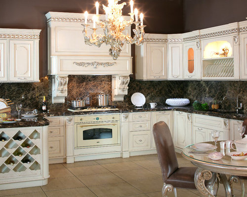 This kitchen was built in Tuscany. The style is contemporary but tending to the classic, especially visible with the table.