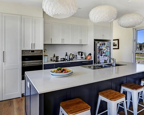 Open plan kitchen with sink built into island bench. Walk in pantry