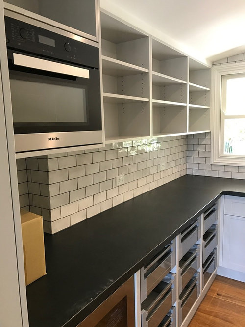Feature subway white wall tile in the pantry off the kitchen. Additional bench space available in pantry as well as storage.