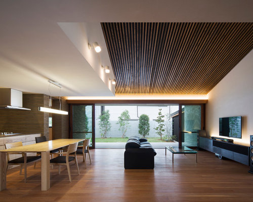 柾目を生かした天井の板張り仕上げ、リビングの左右に配したタイルを重ねてあしらった壁など、ライン使いが空間のよいアクセントに。