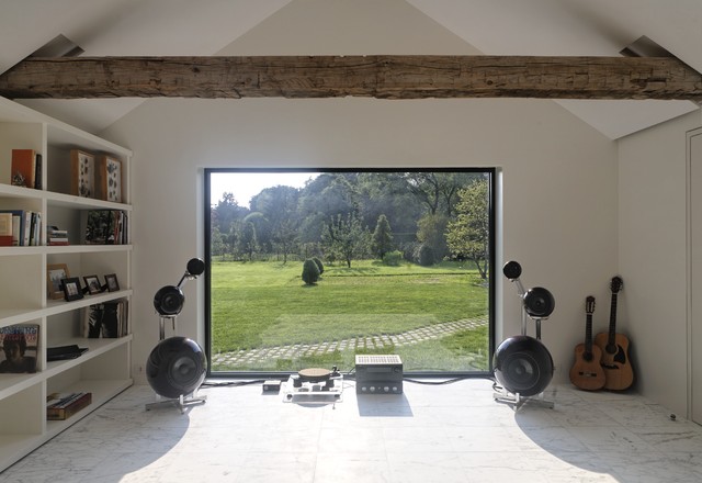 De där högtalarna är riktigt gräsliga, annars gillar jag hela rummet och det stora fönstret med vinyl mitt i allt!