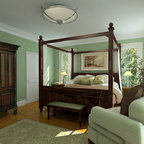 Like the side table and bed color (Very neutral and not too yellow) Also like the bench at the end of the bed. Like the modern lamp with the traditional beside table. Love the play of patterns and textures on the pillows.