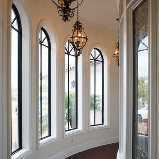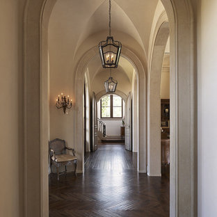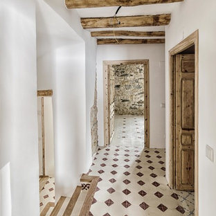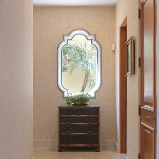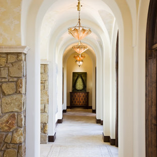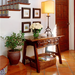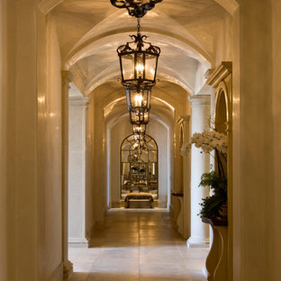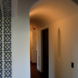 A custom designed hallway to a Spanish style home featuring Moorish style art niche, barrel ceilings, terra-cotta flooring.