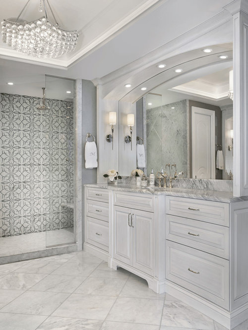 11. Seamless Transitions If there weren’t a glass partition here, you might not even guess that the extended tub surround becomes the shower bench. By using the same tile across the floor, up the sides of the surround and on the entire wall, this bathroom exudes a quiet and calm feeling. Notable detail: The placement of glass shelving at the far end of the shower surround keeps it from being a risk factor for head-banging.Find glass bathroom shelving - jennip2