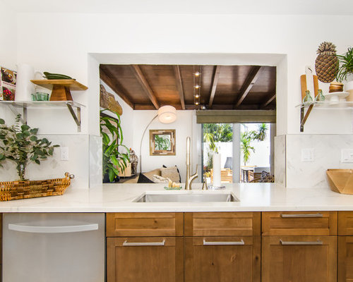 Remember when kitchens were fun? Mid-century homes were full of bright rich colors. Americans were looking to create more function kitchen spaces. This newly renovated Mid-century kitchen hits all the right notes for a small kitchen lots of storage, cool lighting, work space and dynamic tiles for the backsplash. Three colors were choosen from our historic Mid-century tile line; ...