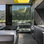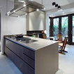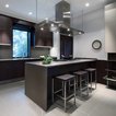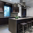 dark wood units, concrete work tops and sash backs