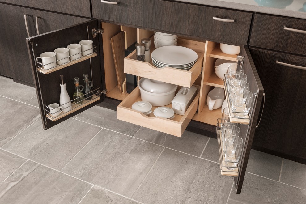 The simple lines of Denali and Hilton come together for a sensible approach to modern style; designed to complement today's busy lifestyle. Denali's textured surface offers rich dimensional flair, while Hilton adds a touch of glimmer with a reflective gloss surface. Both finishes come together on the island as a design focal point offering seating, a second sink and generous storage.