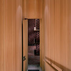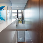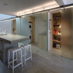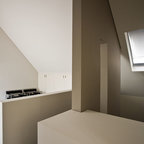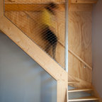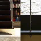It’s possible to solve the problem of a stair guard in many different ways, but here the designer has chosen a minimalist, outwardly effortless expression. The gray of the thin stainless steel cables matches that of the concrete stair run, and their attachment is deliberate and considered.