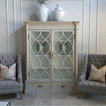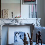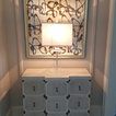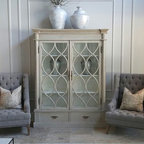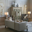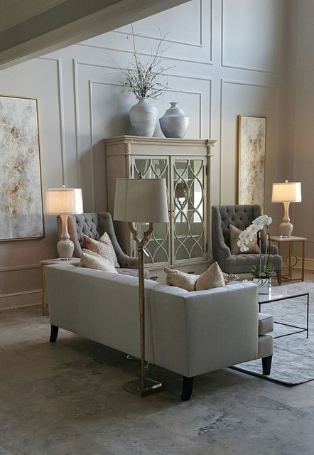 The beautiful cabinet is the focal point of this big wall. Gold finishes on the frames and end tables add brightness.