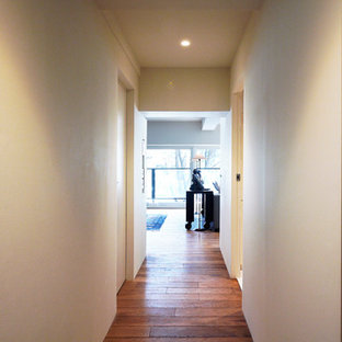 Detalle hall vivienda íntegramente reformada por NATALIA ZUBIZARRETA INTERIORISMO en Vizcaya. Paredes blancas, vigas hormigón vistas, pavimento laminado de roble, mueble vitrina de Hanbel. Alfombra de Fabula Living. Fotografía de Erlantz Biderbost.