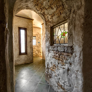 This hallway has lots of character, it features a console table with an oversized mirror, lit by two feature lamps.