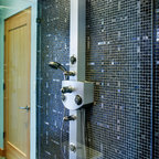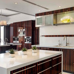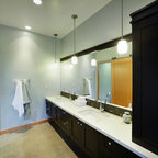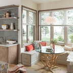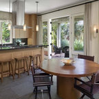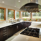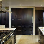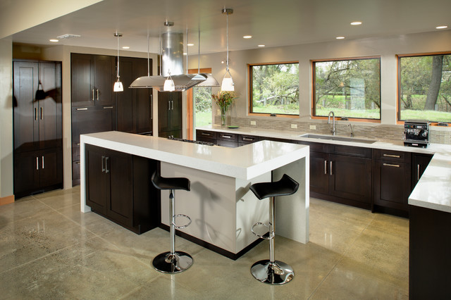 The interior of this newly constructed home, with panoramic views of the adjacent creek, required a mix of exquisite detail and simple design solutions to capture the contemporary design of the the exterior of the home. The rectangular kitchen flows seamlessly from the soaring great room. The center of the functional cabinetry wall features a concrete overlay niche that houses the fully integrated refrigerator and the microwave behind a lift up door. No wall cabinets distract from the beautiful view that is framed by a series of matching casement windows. Glassware and dishes are housed in the tall cabinet adjacent to the appliance niche and in the base cabinet next to the dishwasher. Specialized dish storage roll-outs make unpacking the dishwasher a breeze. The concrete floors with polished aggregate highlights pay homage to the creek visible through the sweeping windows. The seamless waterfall edge treatment for the island and raised counter casual eating area add a touch of elegance to the space.