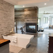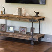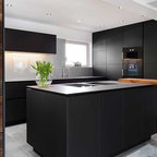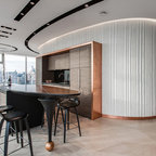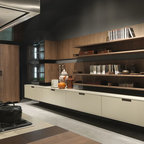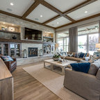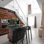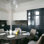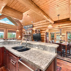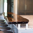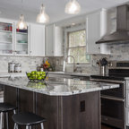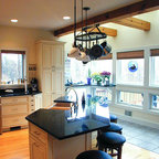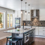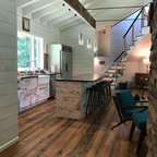 Love all... shelves, cabinet color, island contrast, stools, pennant lights, shelf lighting, countertops, and breakfast top... beautiful floors