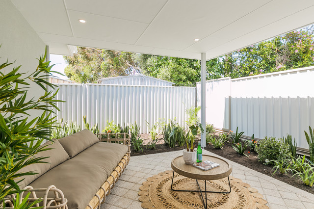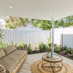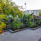 Sub-tropical feel for tiny al fresco area. Facing south so very little sun, and the plants needed to cope with these conditions.