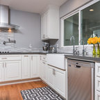 Dark woods below. White top cabinets. Love the hood