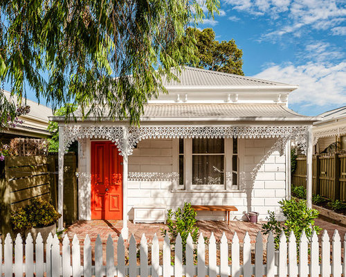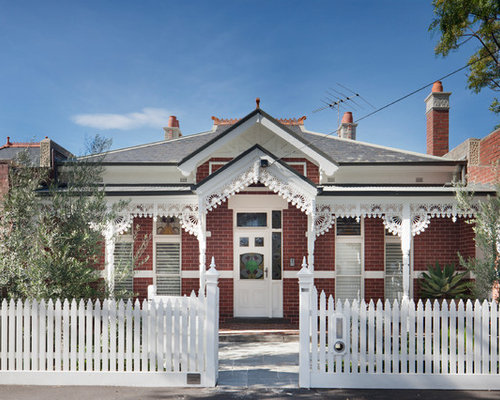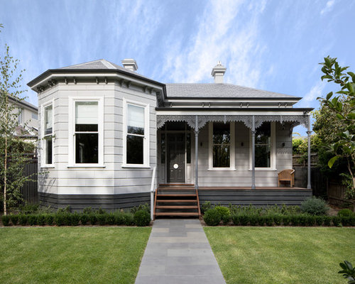Replica Victorian timber block weatherboards to the front facade, new double hung windows, metal lacework and columns to the verandah, replacement of the slate roof with a thoroughly modern and elegant grey colour palette.