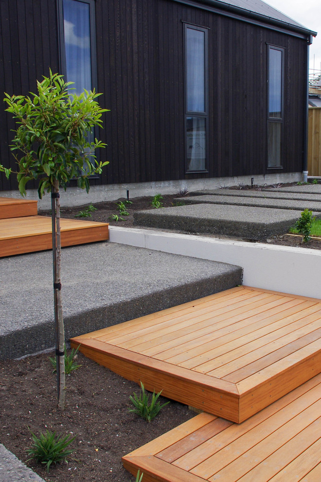 The plaster finished block wall, timber steps and exposed aggregate concrete are materials which complement each other very well. Photos By: Xteriorscapes